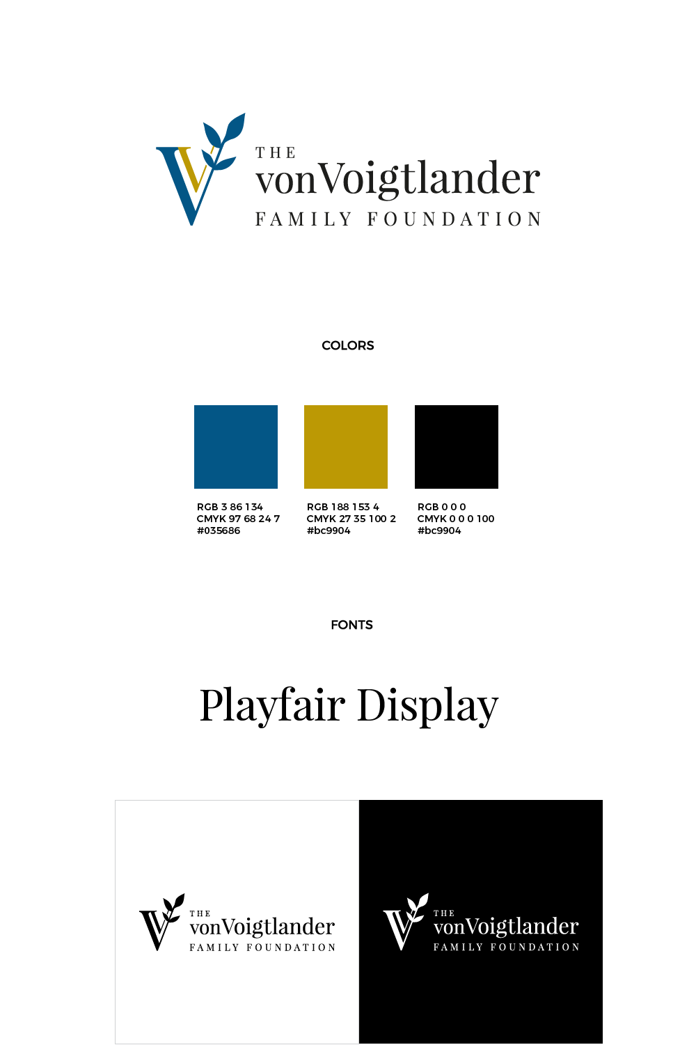 This elegant logo includes a double “V” that symbolizes the Von Voigtlander family. The branch that grows from one of the letters refers to a life that this foundation wants to support – whether this is people, animals or plants. The four leaves represent four family members and four areas of the foundation’s focus – kids, animals, conservation, and military.
